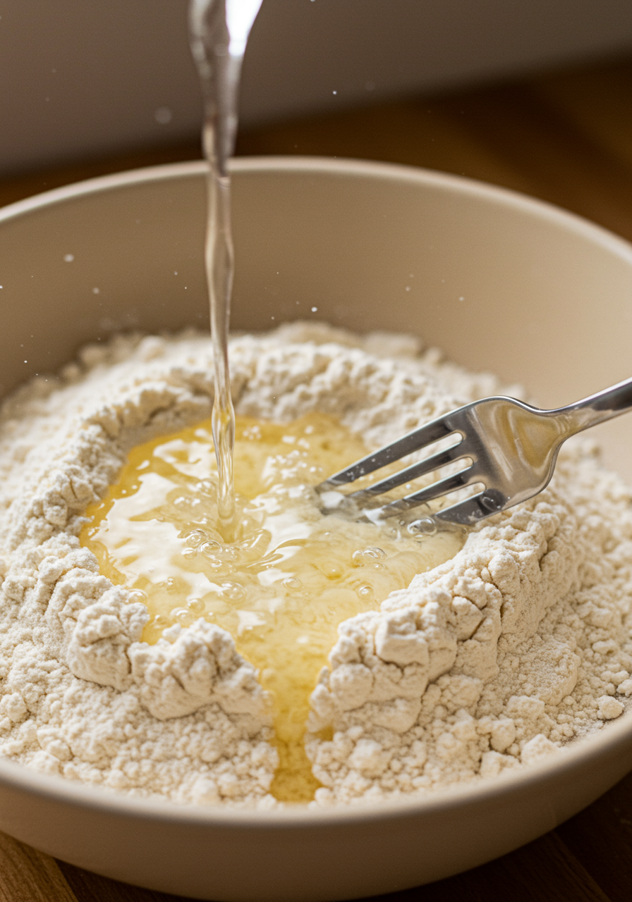 - Into the well add water and slowly mix the flour, adding water from time to time as the dough comes together.