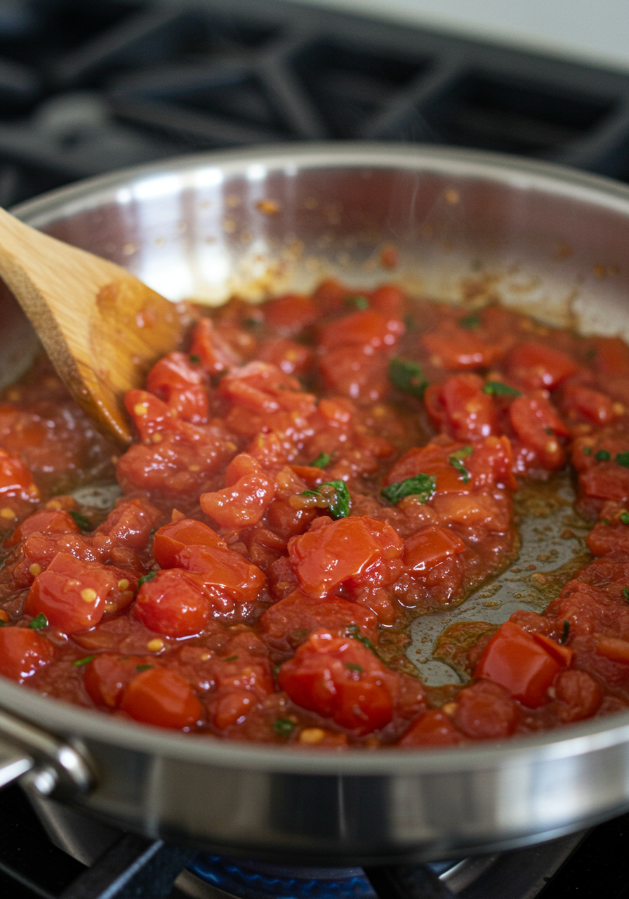Heat the olive oil over medium-high heat in a saucepan with the chopped garlic until the garlic is soft but not brown. Add the cherry tomatoes, salt and pepper and cook rapidly, stirring occasionally.