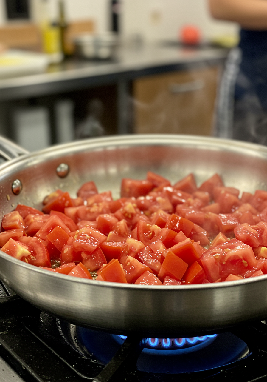 - Add the cherry tomatoes, salt and pepper and cook rapidly, stirring occasionally.