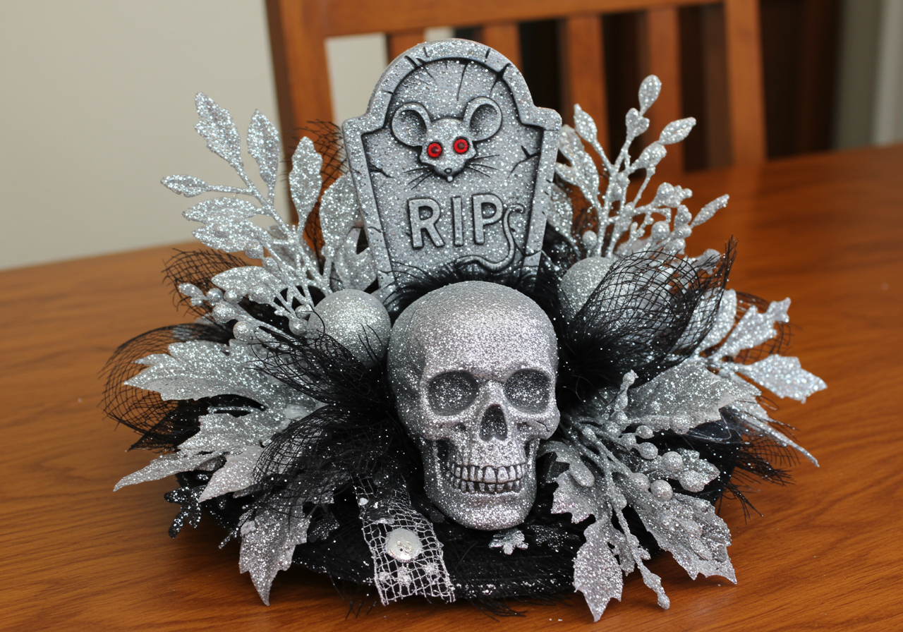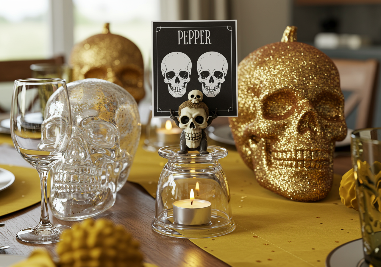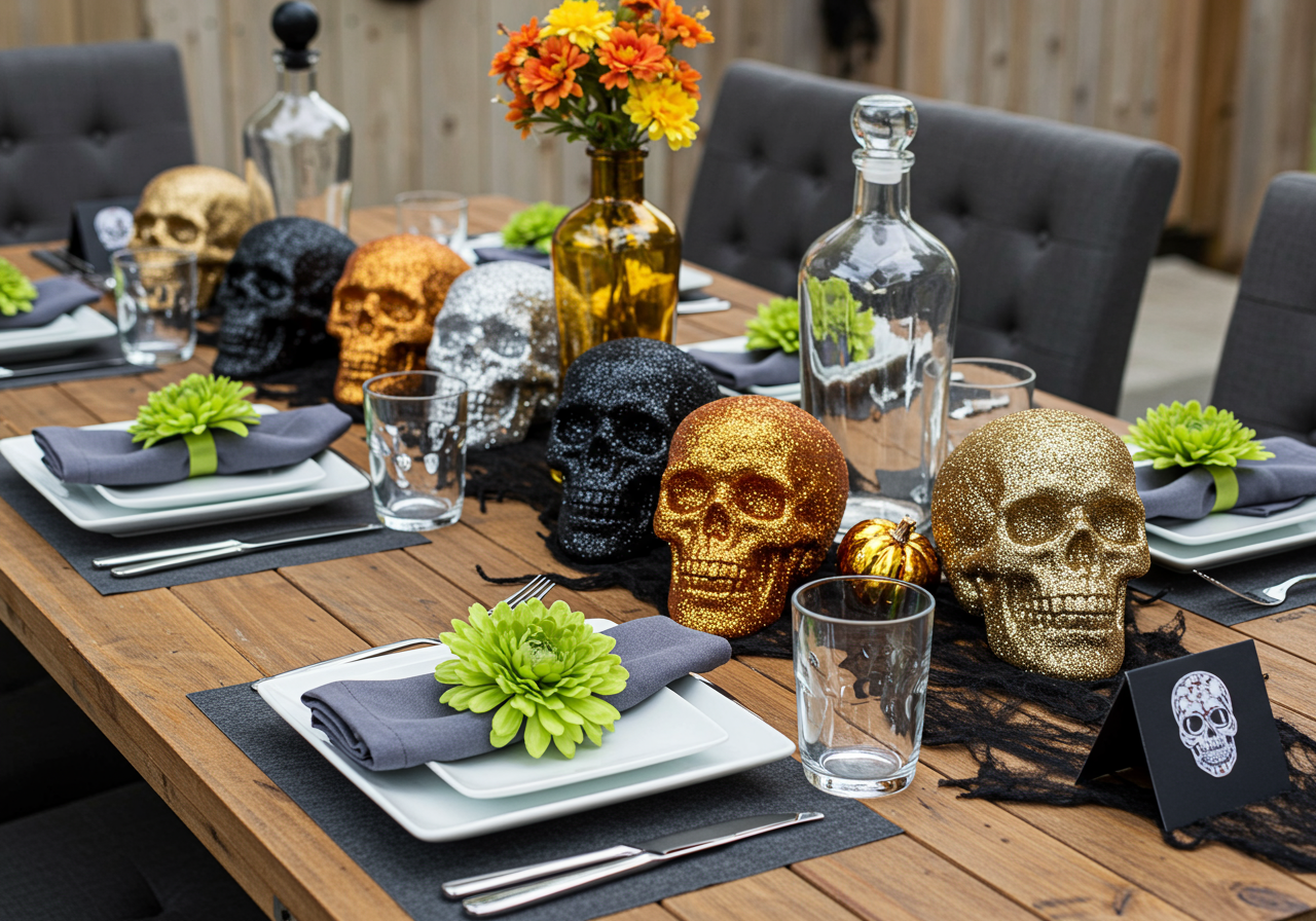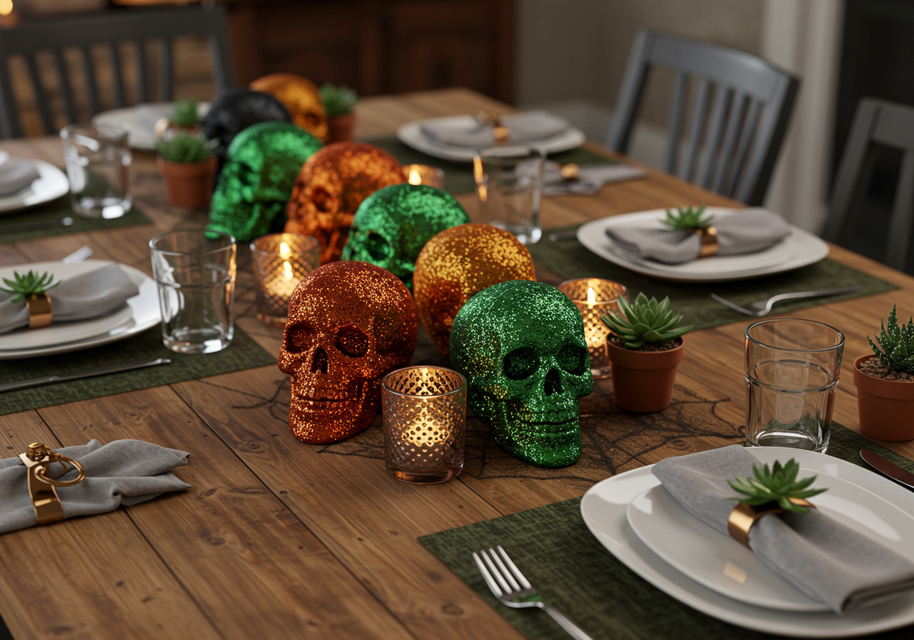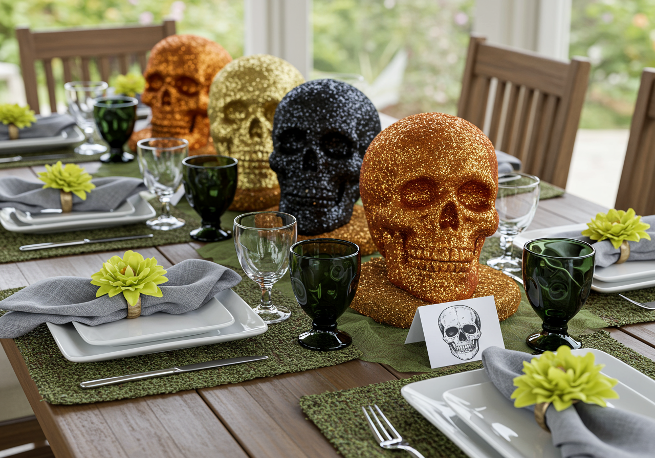 Skulls in four different colors adorn the center of the table.