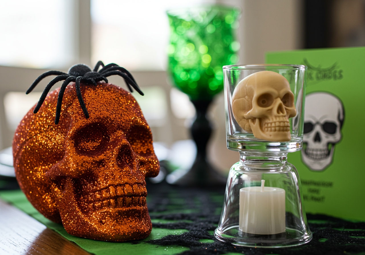 For glasses, we used ghost goblets, perfect for serving red wine on Halloween. The glasses create the spooky illusion that the wine is bleeding into the stem. For place cards, we took plastic skulls found at a craft store and made a cut on top of each one. Then we found a skull graphic and added each guest's name. Once each design was printed and cut out it was placed on a green place card with two-sided puffy tape and placed into the plastic skull. We then sat each card on top of an upside-down mini-martini glass with a faux candle underneath to create an up-lit skull effect. To finish the table off, we placed skull candles and skull vodka bottles next to wine bottles capped with crystal skull-headed corks.