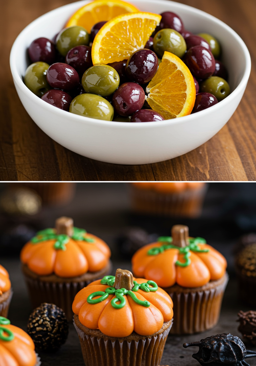 As an appetizer, we served Orange Marinated Olives, delicious and consistent with the color theme and for dessert, we had Pumpkin Top Cupcakes.